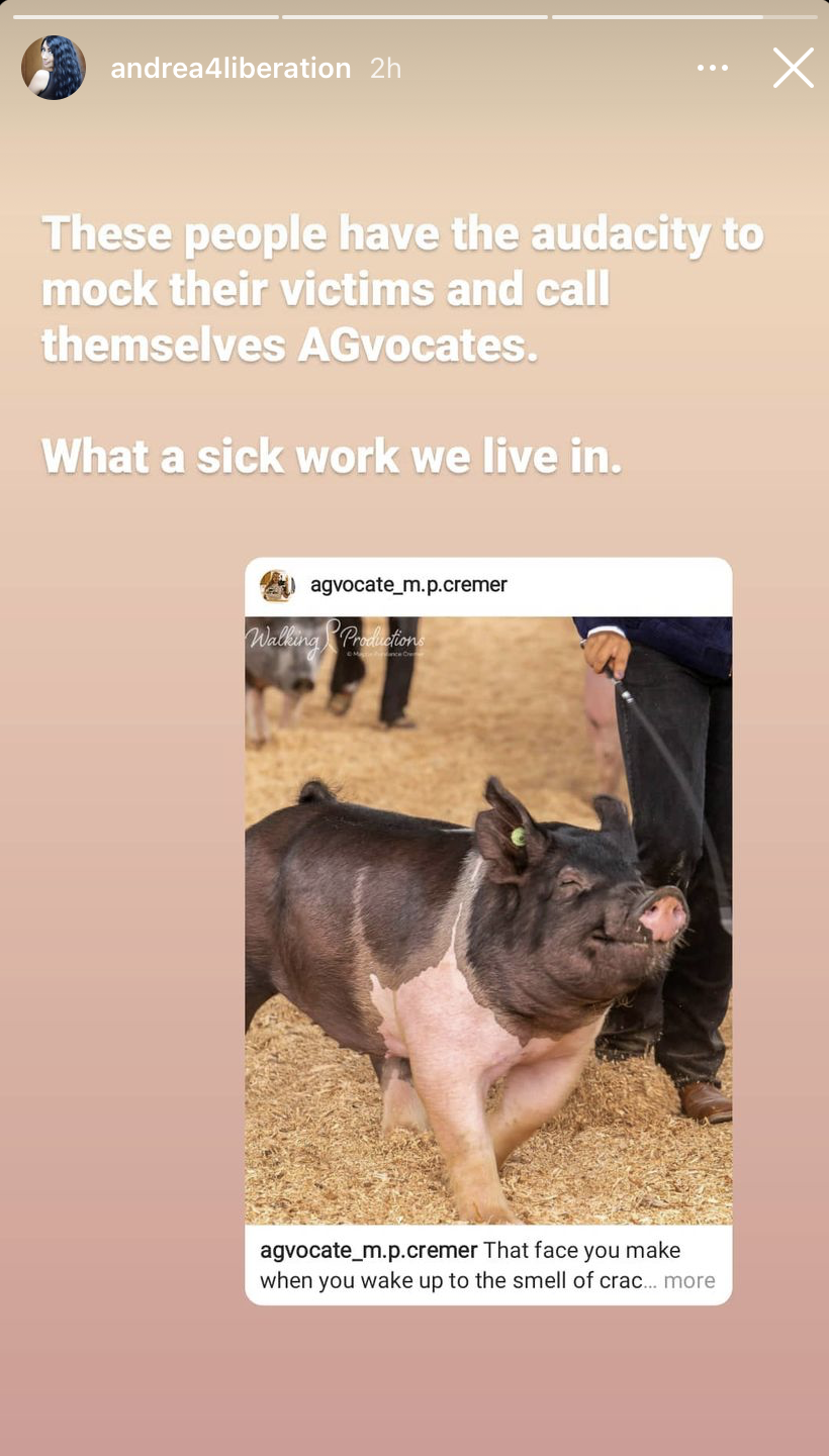 The activist in question goes by the Instagram handle @andrea4liberation and has 11.6 thousand followers. They have a master’s degree in Animal Law and frequently posts videos of protests and tear-jerking photos of baby animals.